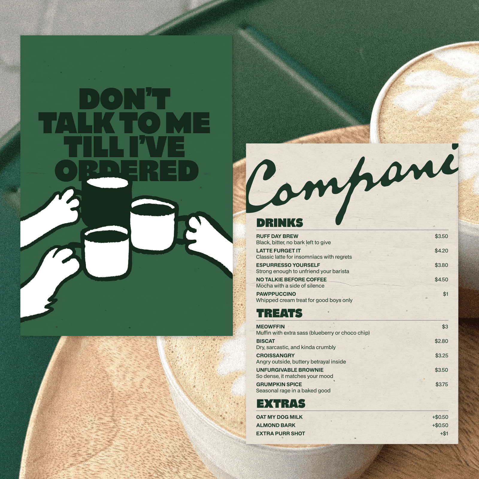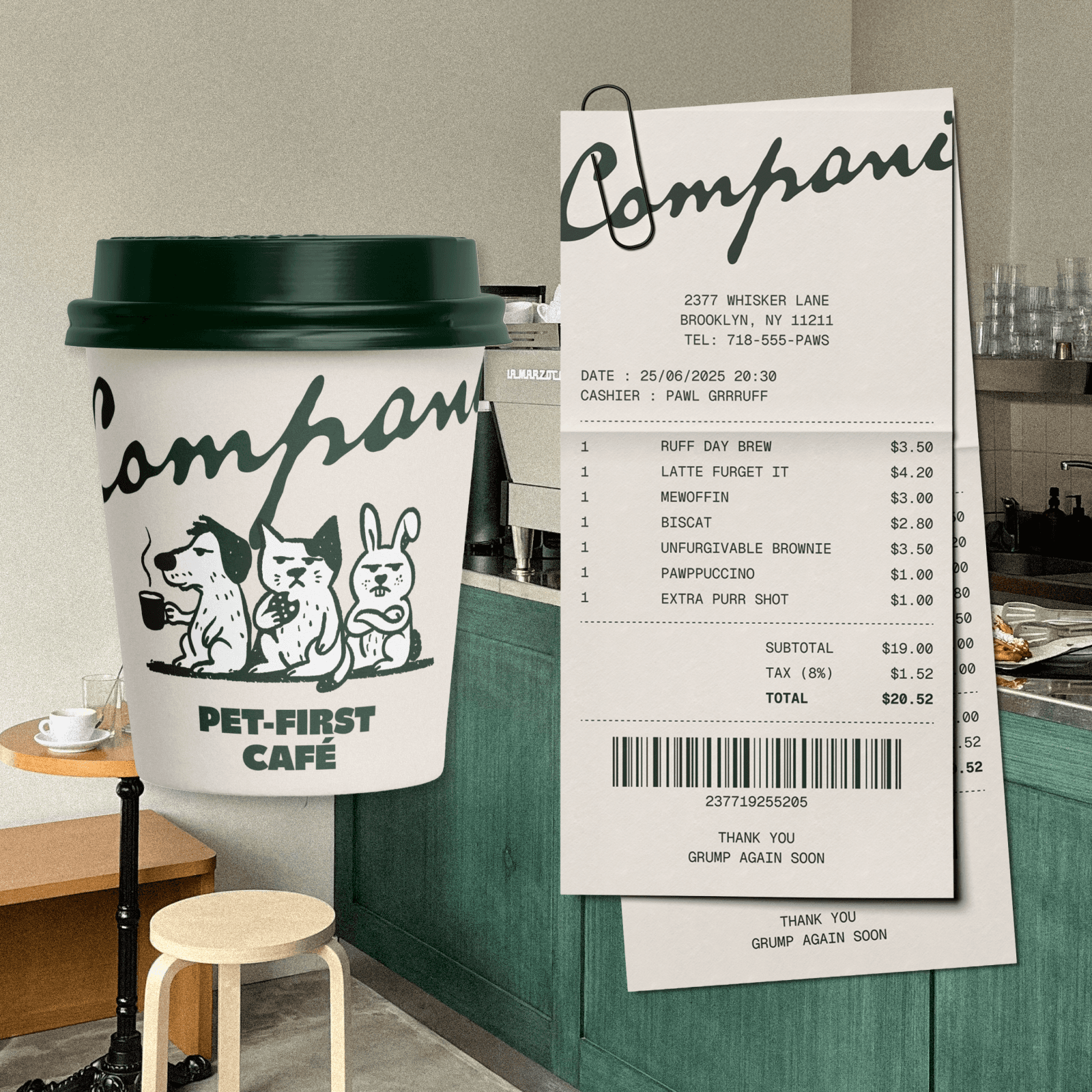 Créer une marque attachante et décalée grâce à un tone of voice mêlant humour, second degré et jeux de mots autour des animaux et du café. L’idée est de parler aux humains comme si c’était les animaux les clients prioritaires, pour un univers grincheux mais attachant.
